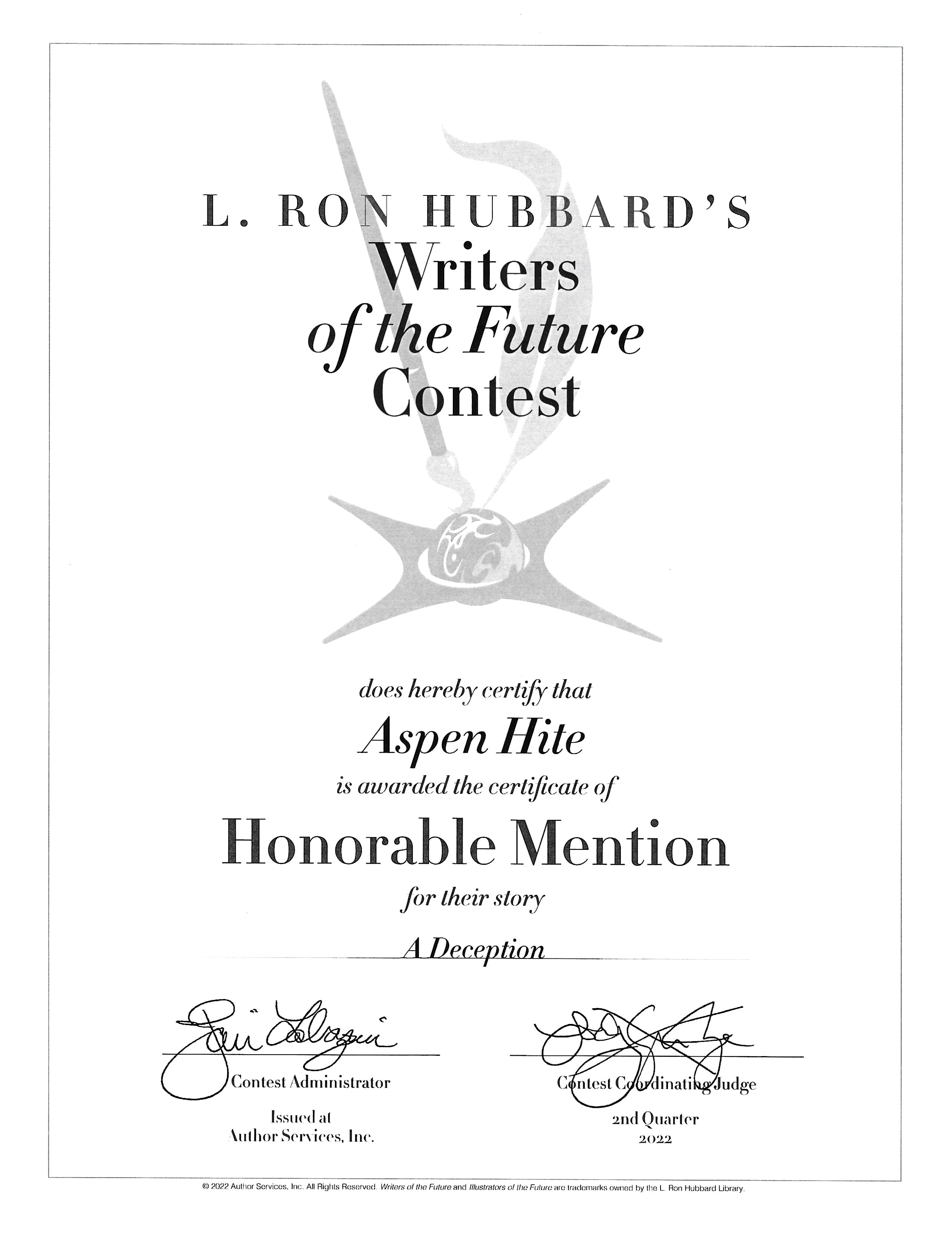 I am thrilled to have earned an Honorable Mention in the L. Ron Hubbard Writers of the Future Contest for my story A Deception, a short little tale about a god, a siren, and an entrance to the Underworld.